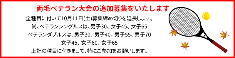 ■一般大会等情報 ・栃木県秋季テニス選手権大会ダブルス 本戦初日結果 男子差替え(10.09) ・栃木県秋季テニス選手権大会シングルス 結果(10.07) ・栃木県クラブ対抗テニス大会 予選会 大会案内・申込用紙(10.06) ・両毛地区テニス大会(公認)(一般)大会要項・ドロー(9.17) ・栃木県選抜テニス選手権シングルス 大会案内・申込用紙(9.12) ■ベテラン大会等情報 ・県民スポーツ大会 要項・組合せ・申込用紙・コート割り(10.08) ・栃木県秋季ベテランオープンテニス選手権ダブルス ドロー(10.02) ・栃木県冬季ベテランテニス選手権シングルス 大会案内・申込用紙(9.18) ・栃木県秋季ベテランオープンテニス選手権シングルス 要項・ドロー(9.01) ■ランキング情報 ・ランキング更新 ダブルス(ベテラン)(9.10) ・ランキング更新 シングルス(ベテラン)(9.10) ・ランキング更新 シングルス(一般)(8.5) ・ランキング更新 ダブルス(一般)(7.7) ■講習会・研修会情報 ・2025年 (公財)日本スポーツ協会公認スポーツ指導者研修会(10.07) ・親子・キッズわくわくテニス教室(8.25) ・2025年度 障がい者2作業所合同『パラテニス教室』報告書(6.18) ・2025年度公認コーチ4養成講習会受講者募集(3.6) ■その他 ・2025年度登録について ・2025年度メール会員登録表 ・TTA行動規範